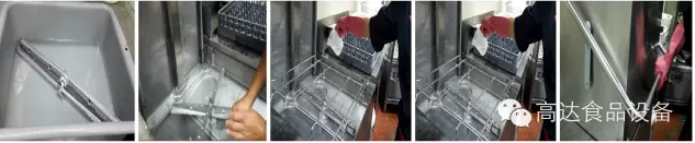 2、摆筐:花洒预冲洗,必要时需清水浸泡,完成后再摆筐(浸泡注意:a、餐具不露出水面 b、水温为50℃左右 c、加水量是水池容积的70%~80% d、浸泡时间为5~20分钟)